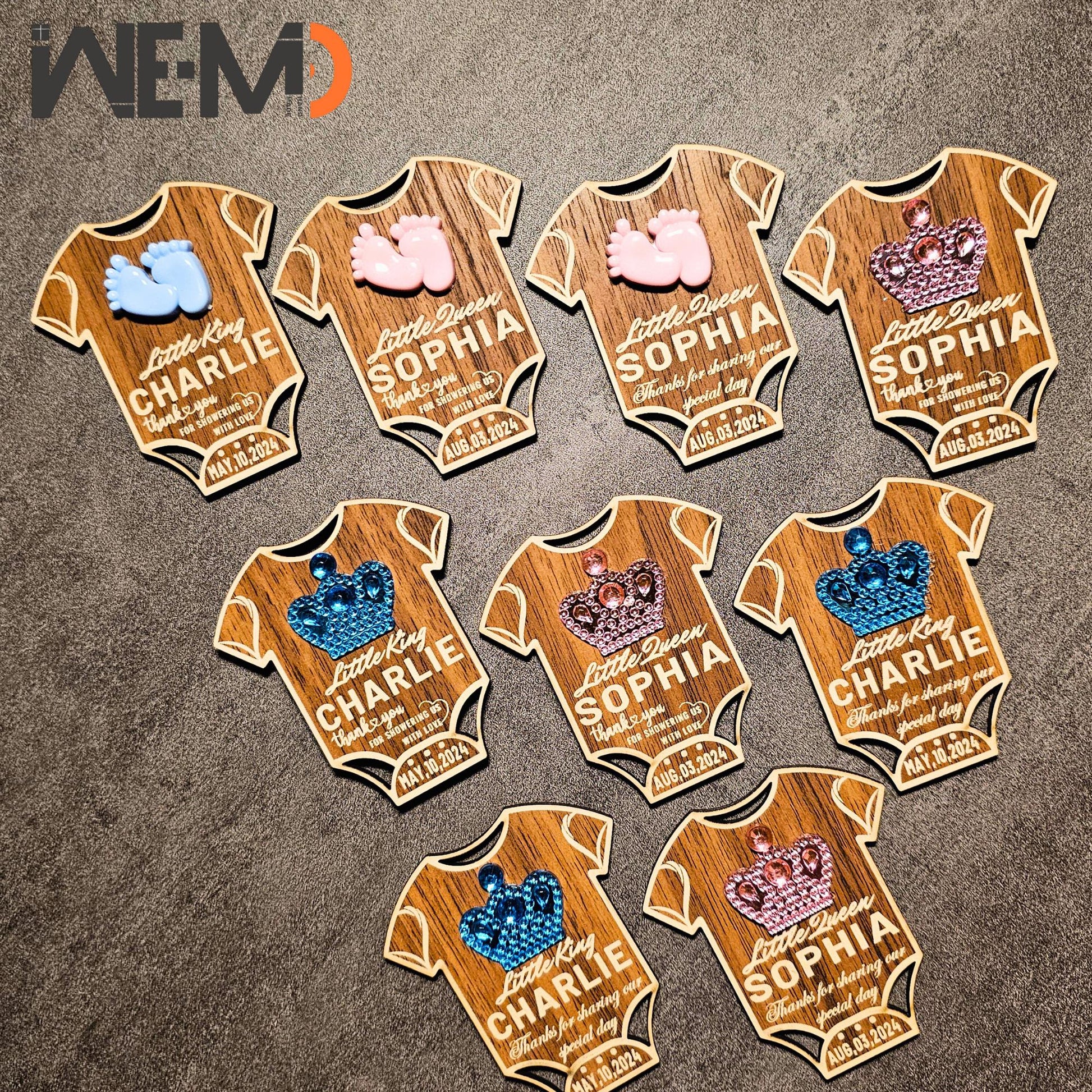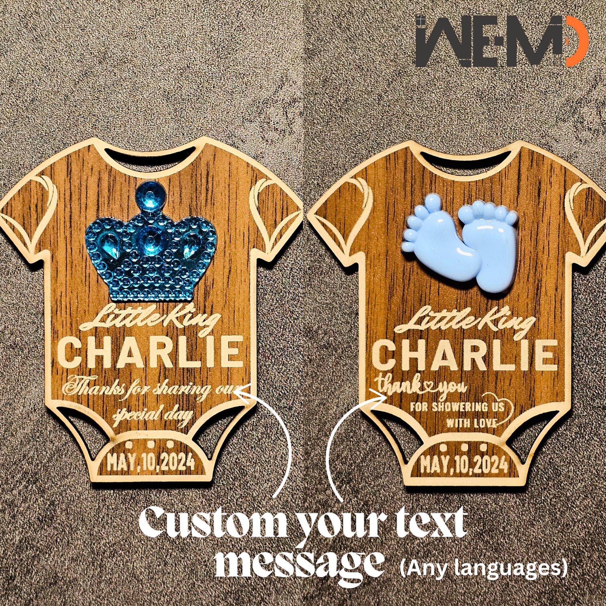 Celebrate the arrival of your little one with our personalized wooden baby shower magnet favors – handcrafted from premium walnut plywood and laser engraved with your baby’s name and date. Each piece features a charming 3D decoration (baby crown or tiny feet) and includes a strong magnet on the back, making it a perfect keepsake. Whether you're planning a baby shower, a newborn celebration, or sending thank-you gifts to guests, this rustic and heartfelt favor adds a unique, customized touch that everyone will remember.